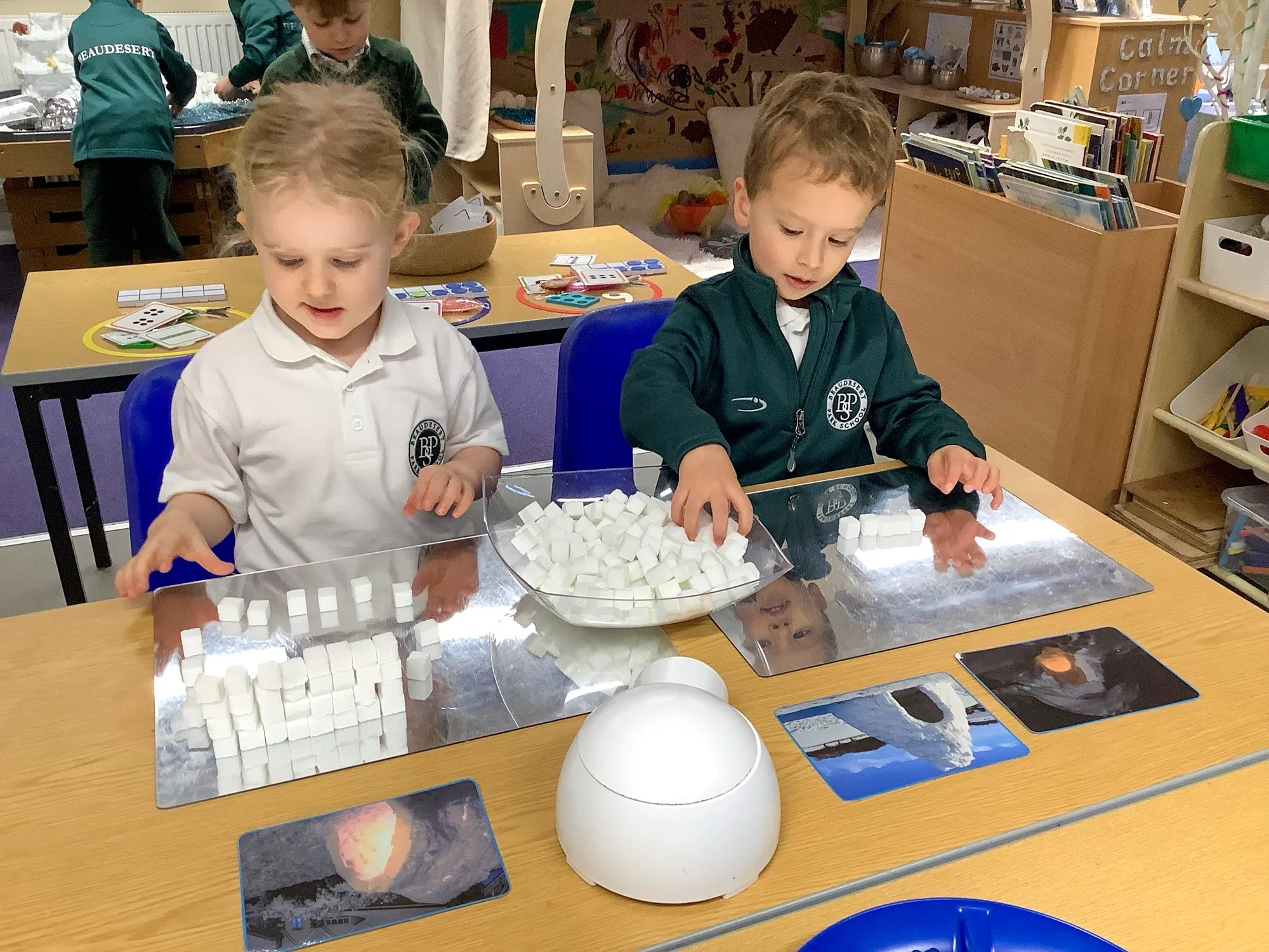 In Reception, children have also been reflecting on our cold and icy weather, playing with ice and making predictions about how it will melt. They used this as inspiration for their writing and construction work.