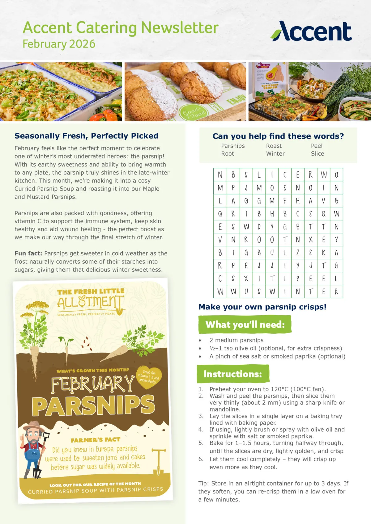 If you would like to read Accent Catering's newsletter, you can download it below. The newsletter includes information about fresh, seasonal foods along with recipes and puzzles.
